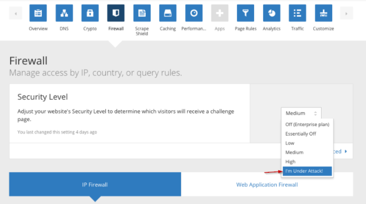 - La meniul Firewall , la Security level accesati varianta drop down si selectati „I’m under attack!”