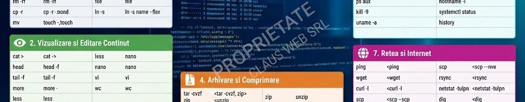 Comanda Descriere Detaliata (Claus Web SRL) 1. Gestiune Fisiere si Directoare ls Listeaza fisierele dintr-un director. Optiuni utile: -al (arata fisiere ascunse si detalii), -R (recursiv). cd Schimba directorul curent. cd .. (inapoi), cd ~ (acasa), cd / (radacina). pwd Afiseaza calea completa a directorului in care te afli (Print Working Directory). mkdir Creeaza un…